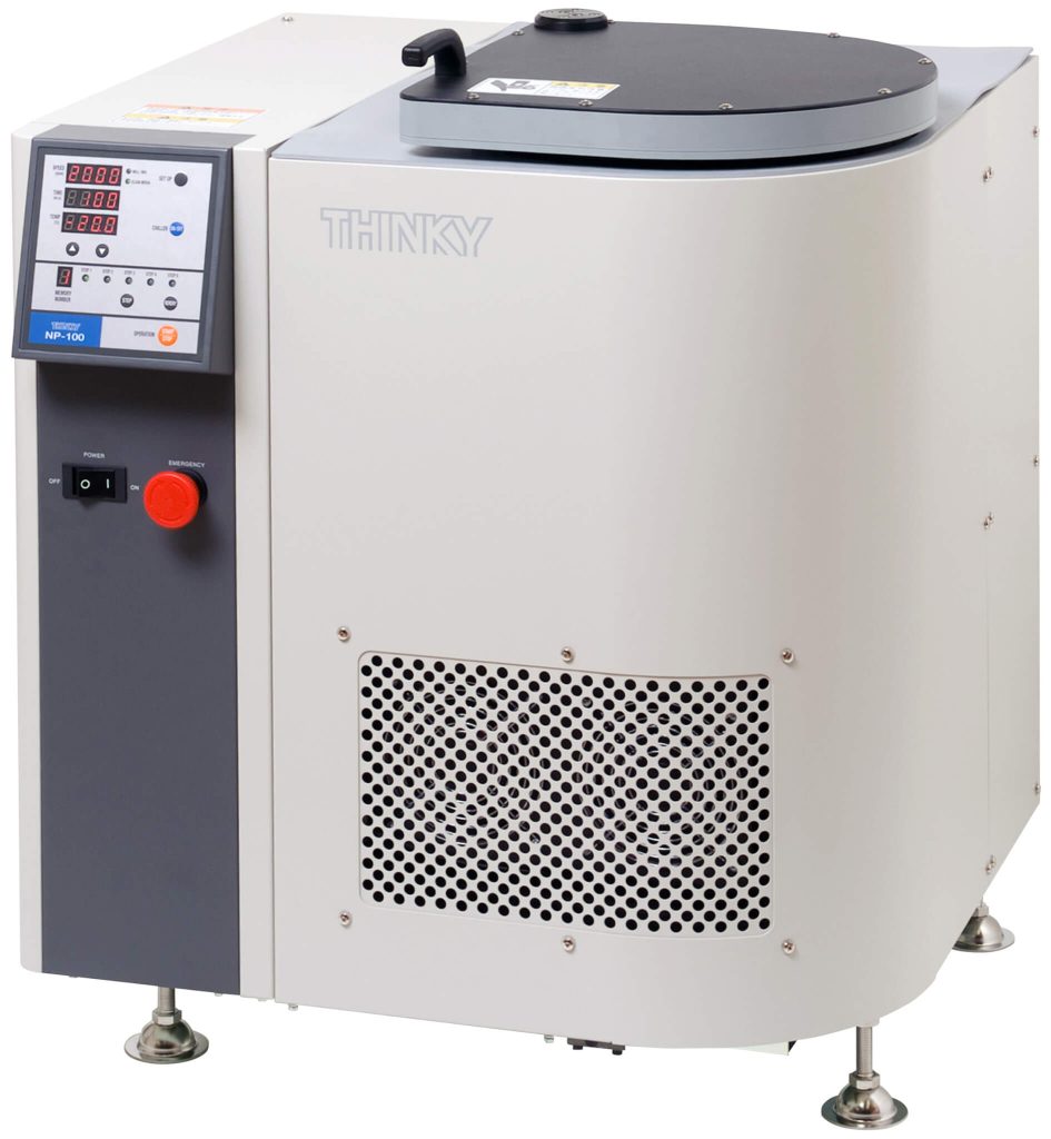 The THINKY NP-100 Nano Pulveriser breaks up particles using impact fragmentation, taking larger particles down to nano-size. In a controlled process taking only minutes, particles in the 10 micron range are reduced to 100 nanometre sizes or less with tight particle size distribution. The THINKY NP-100 uses planetary revolution and rotation action to produce a centrifugal force on a 45° plane to create strong concentrated energy that increases collision, friction and shear force, combined with a chiller to provide temperature control. The nanoparticles are subsequently separated out from the pulverising media by using a mesh filter in a ‘Clean Media’ mode, a process which takes place in the same machine.