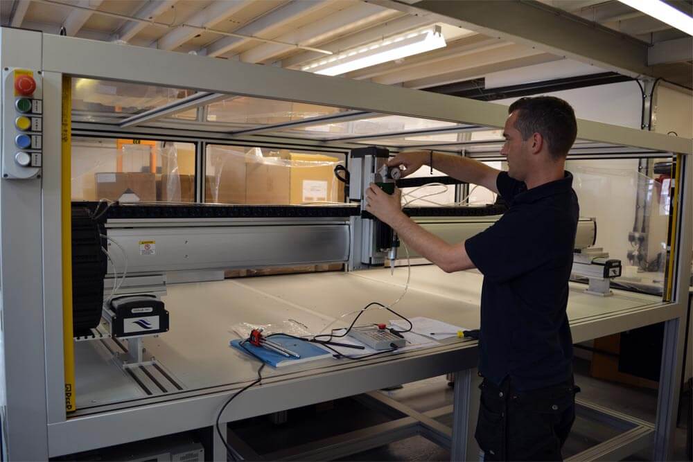 We can provide full integration services, including robotic dispensing systems with enclosures delivered to your specifications, or integrating the robots with other equipment. The robots are easy to use – you create programs for the robot using a teach pendant which saves them to memory, so operators only have to push a button to get started. Our integration team train you and your operators so that all users are confident and capable.