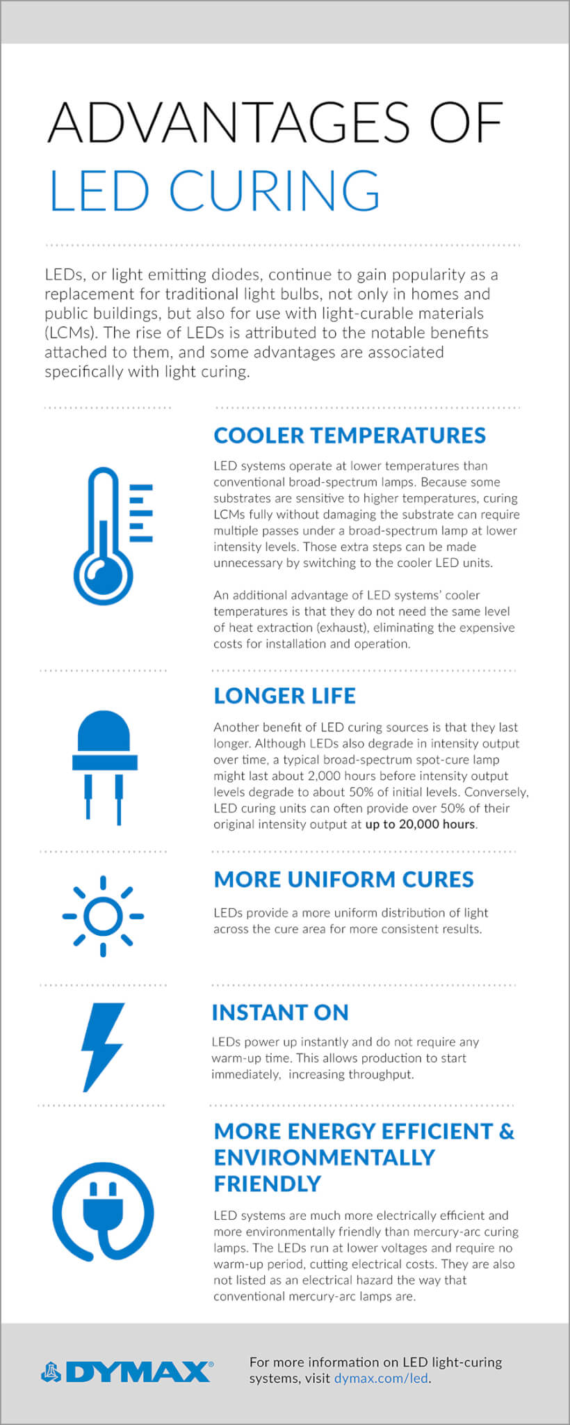 A nice infographic from our friends at Dymax discussing the advantages of curing using LED-based equipment. Click on the image for a larger version.