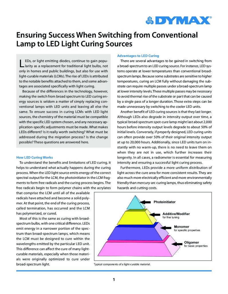 LED UV curing lamps feature narrower wavelength spectrum emission than that of conventional equipment, so assessment needs to be made on existing chemistries to see if they cure adequately using the narrow bandwidth. Material and adhesive manufacturers have formulations specifically designed to cure with LED based lamps.