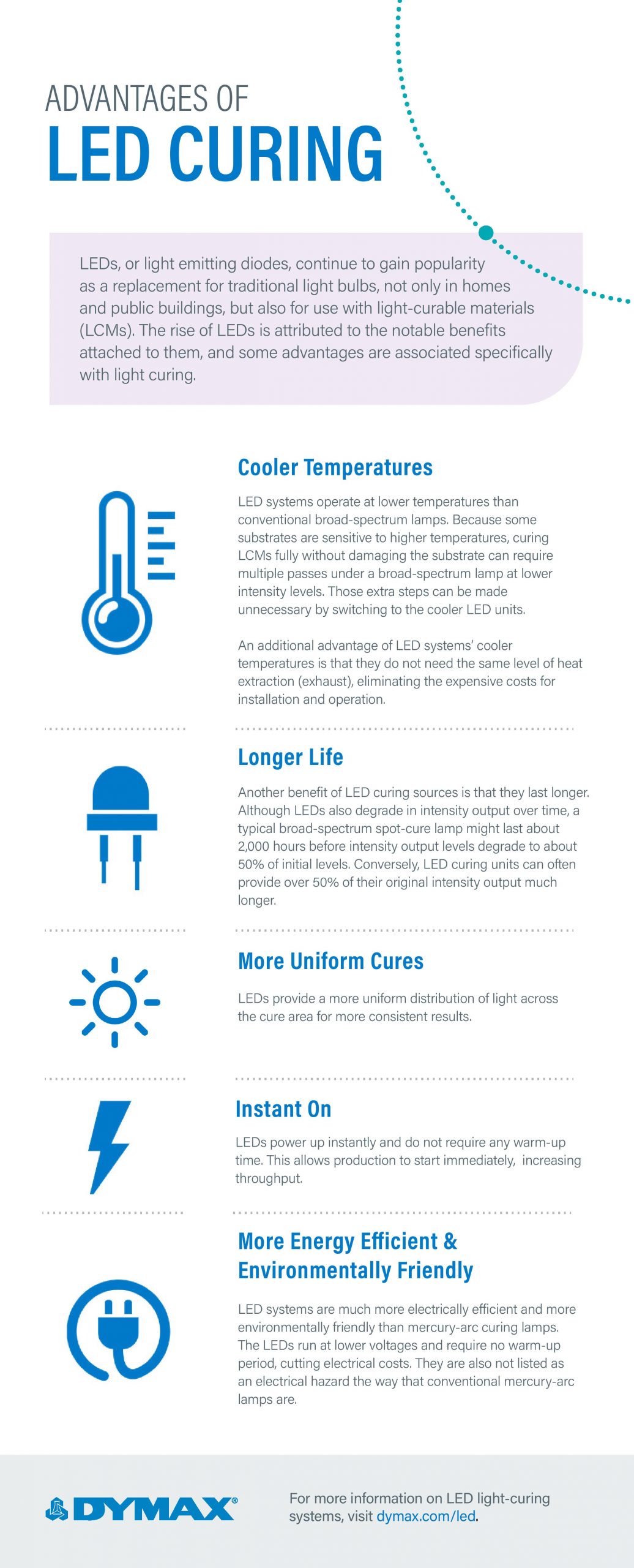 Curing equipment based on LEDs can achieve uniform frequency and intensity output for consistent cures, facilitating superior process control, increased manufacturing throughput and lower operating costs. LED UV light curing offers several significant advantages over conventional arc UV sources: