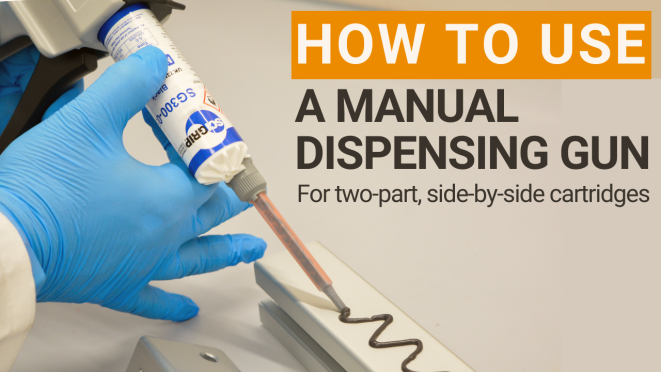 Dispensing guns for adhesives and sealants which are supplied in two part cartridge systems. The cartridges are easily loaded into the gun, and a static mixing nozzle is applied. The gun gives control to the dispensing of the adhesive through the mixer nozzle, either with simple hand pressure, or with pneumatic input.