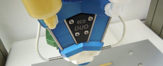 The preeflow eco-DUO uses the precision dispensing technology of the preeflow eco-PEN; by integrating two eco-PENS through a manifold and a static mixing nozzle, the eco-DUO provides extremely precise metering, mixing and dispensing of critical two-part materials like epoxies and silicones.